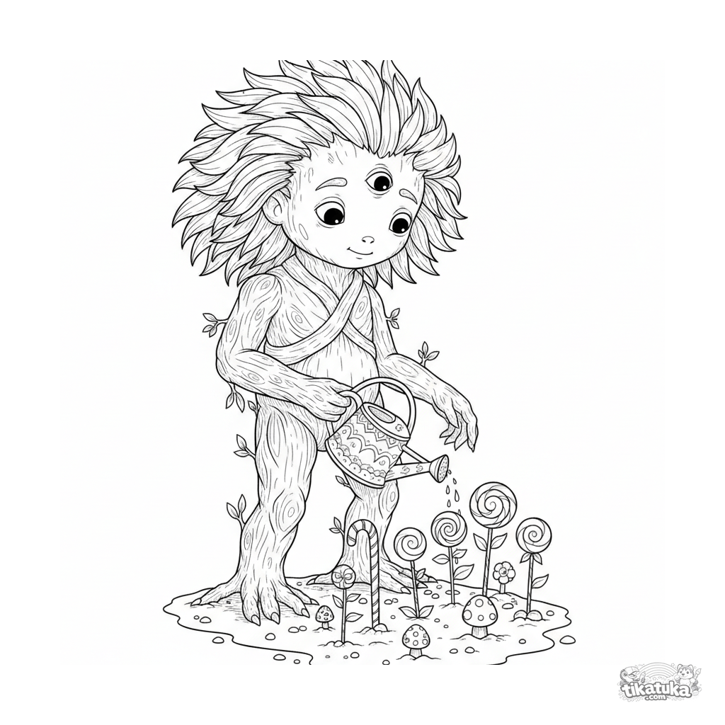 Detailed realistic-style coloring page: a botanical monster tending a candy cane garden at a picnic. For kids 10-12 years old, rich in natural details.