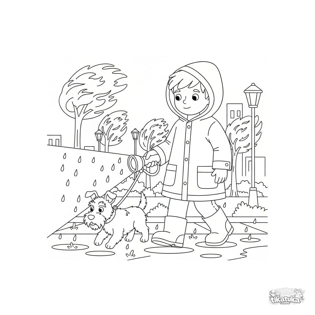 Coloring page for tweens 7-9: a boy with his dog and a flashlight walks through an autumn downpour on a wet sidewalk. Expressive poses, moderate background, scene context.