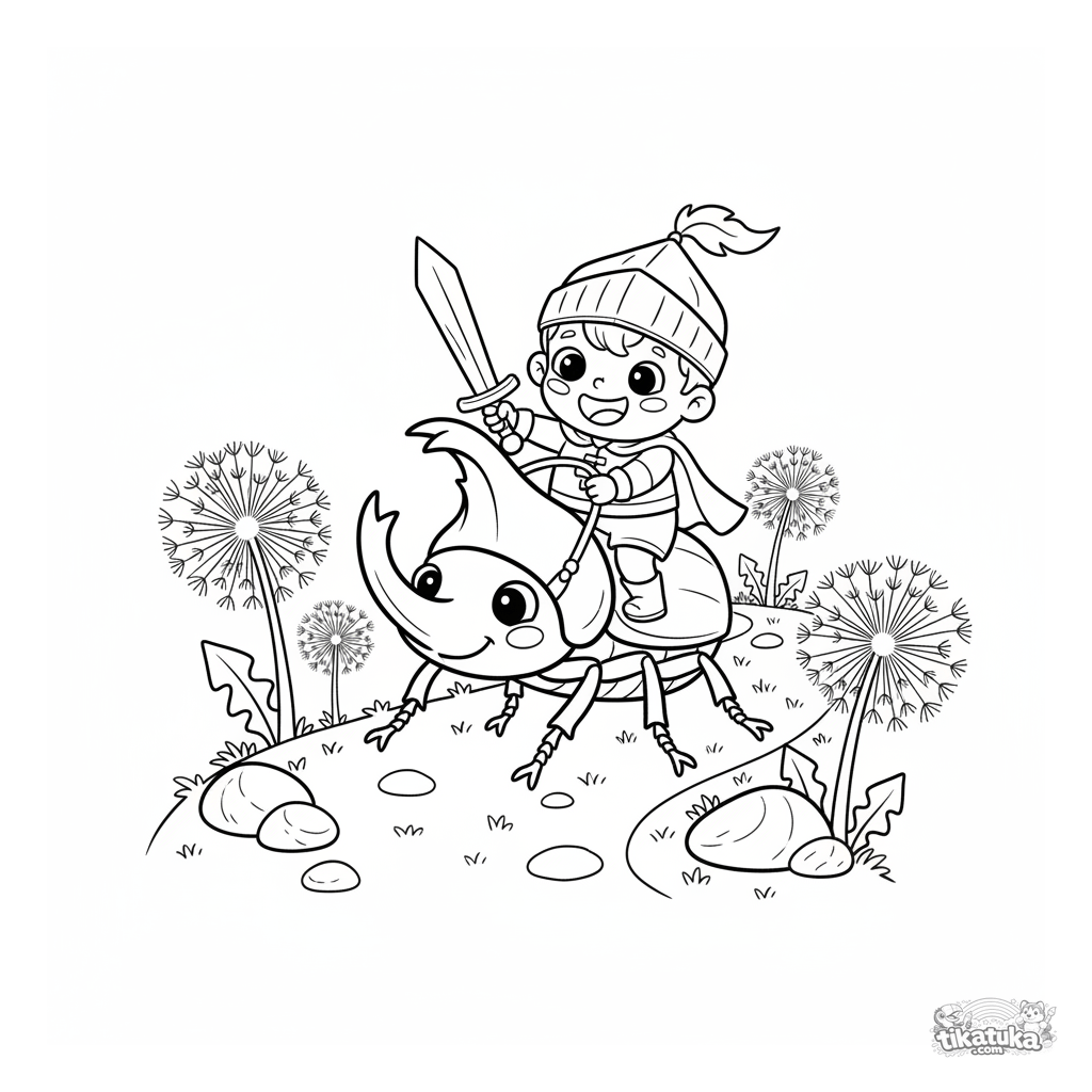 Coloring page of a boy knight riding a large beetle down a garden path. For kids 4-6 years old. Adventure scene with dandelions.