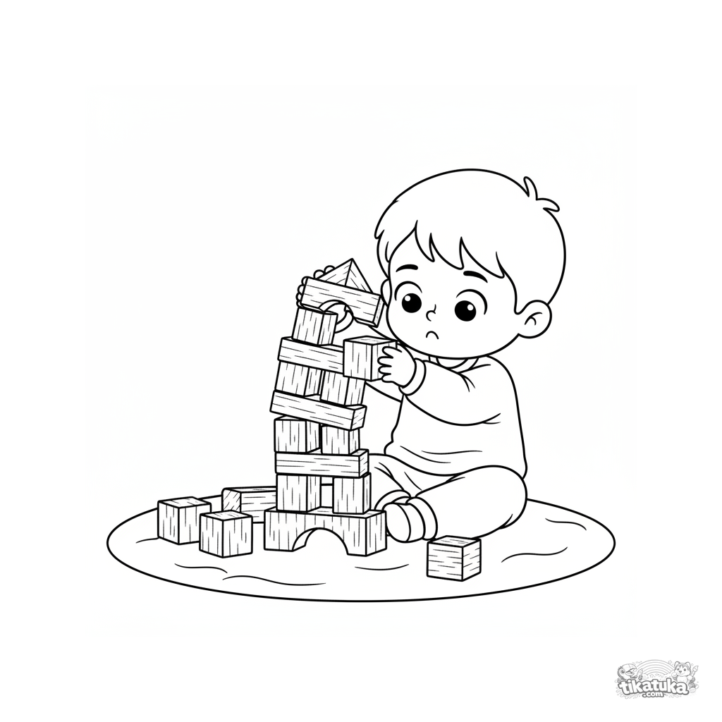 Coloring page for toddlers 2-3: a boy builds a tower with big blocks. Large simple shapes, low detail, perfect for first crayons.