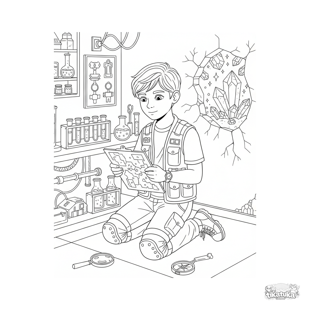 Detailed coloring page for kids 10-12: a boy cartographer in a secret lab, studying a map of a crystal cave with a magnifying glass and compass.