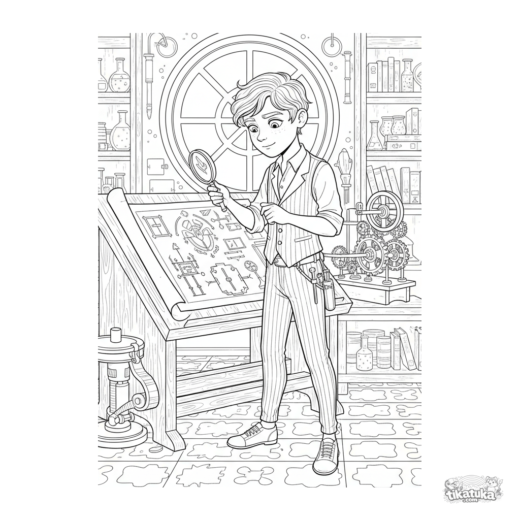 Complex coloring page for kids 10-12: a boy in a secret laboratory studies a blueprint of an ancient mechanism. Detailed scene in a vintage engraving style for patient coloring.