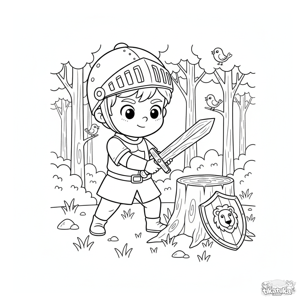 Coloring page for boys 4-6: a young knight in a simple tunic practices with a wooden sword by a mossy stump in a forest clearing. A scene of bravery and imagination.