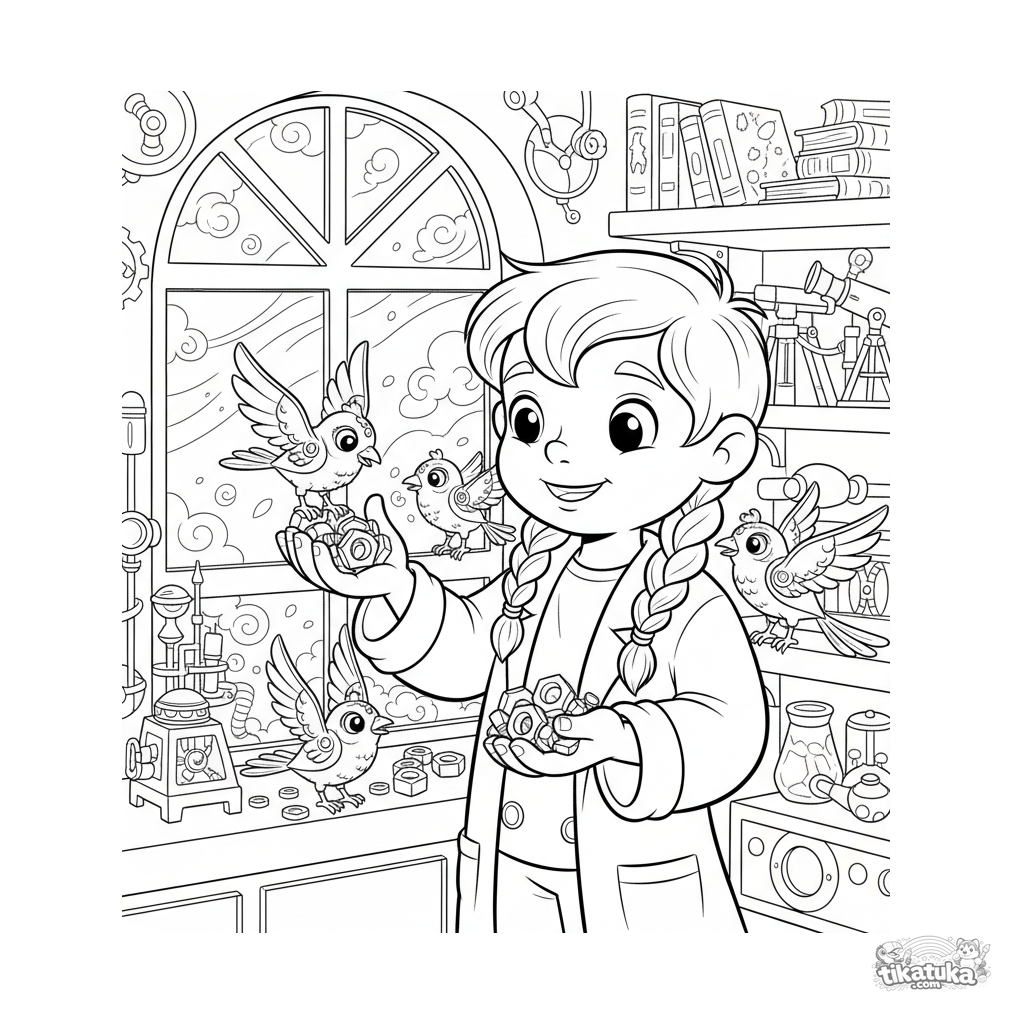 Coloring page for tweens 7-9: a boy inventor in a secret laboratory feeds tiny clockwork mechanical birds from his hand.
