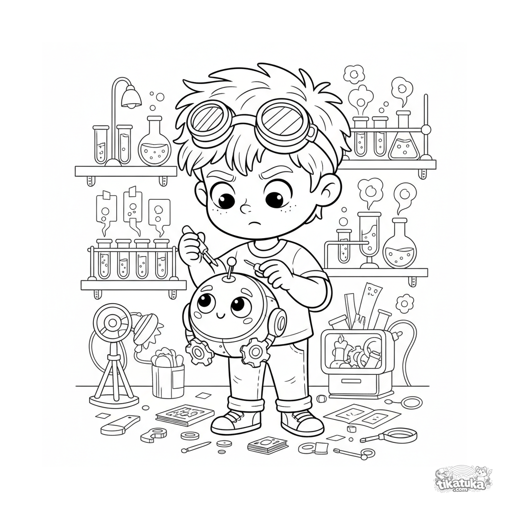 Coloring page for kids 4-6: a boy inventor and his gear-pet robot in a secret laboratory. Plenty of fun details to color.