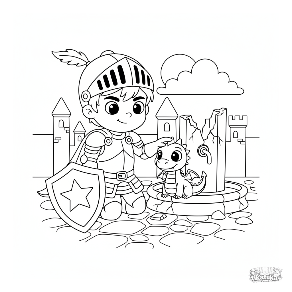 Coloring page for boys aged 5-8: a young knight in a stone courtyard gently pets a dragon hatchling next to a fountain.