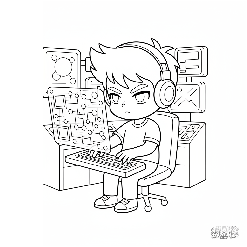 Coloring page for kids 7-9: a boy programmer works with a holographic interface in a secret high-tech laboratory.