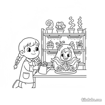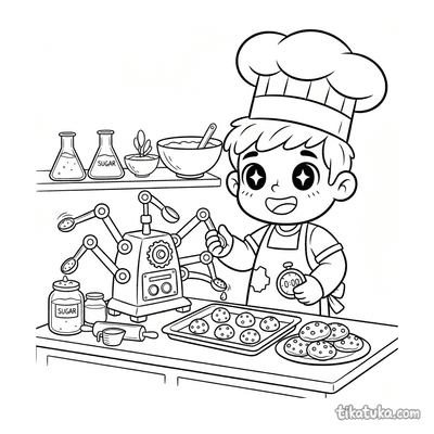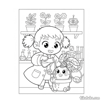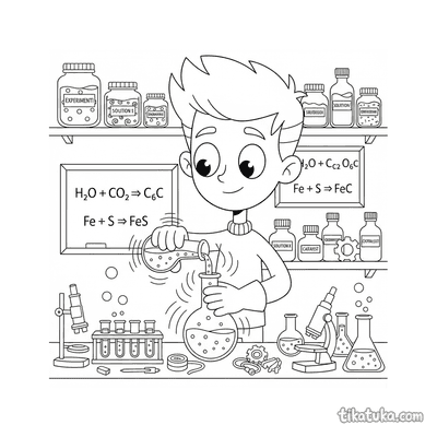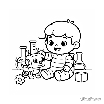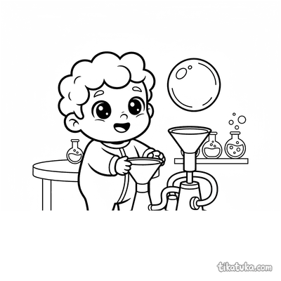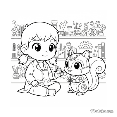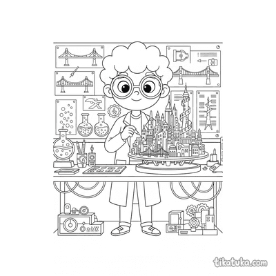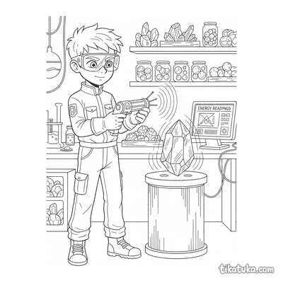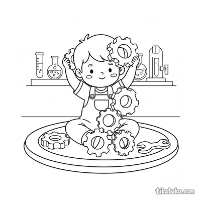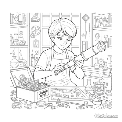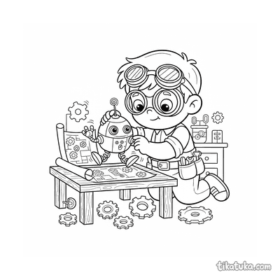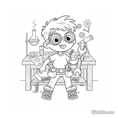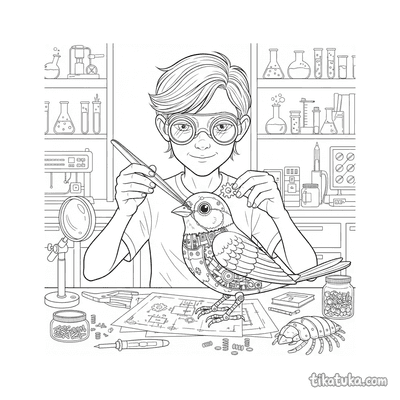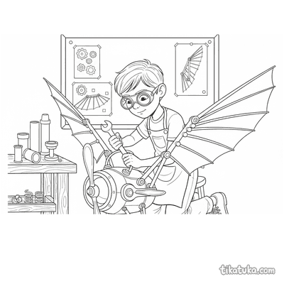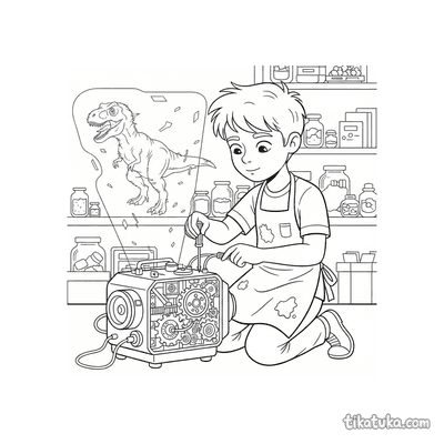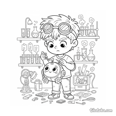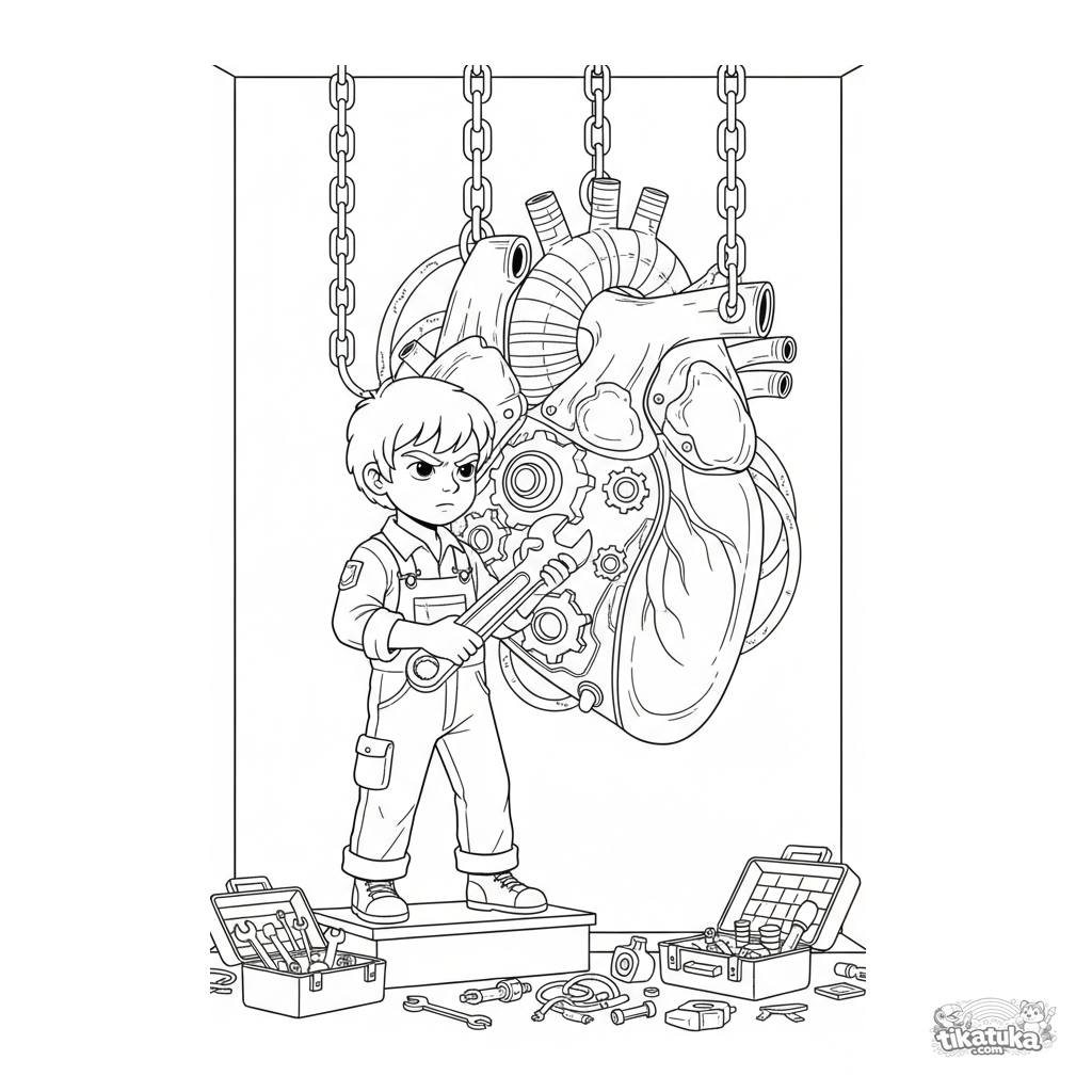 Detailed coloring page for kids 10-12: a boy engineer in a secret lab repairs a giant mechanical heart with gears and glowing tubes.