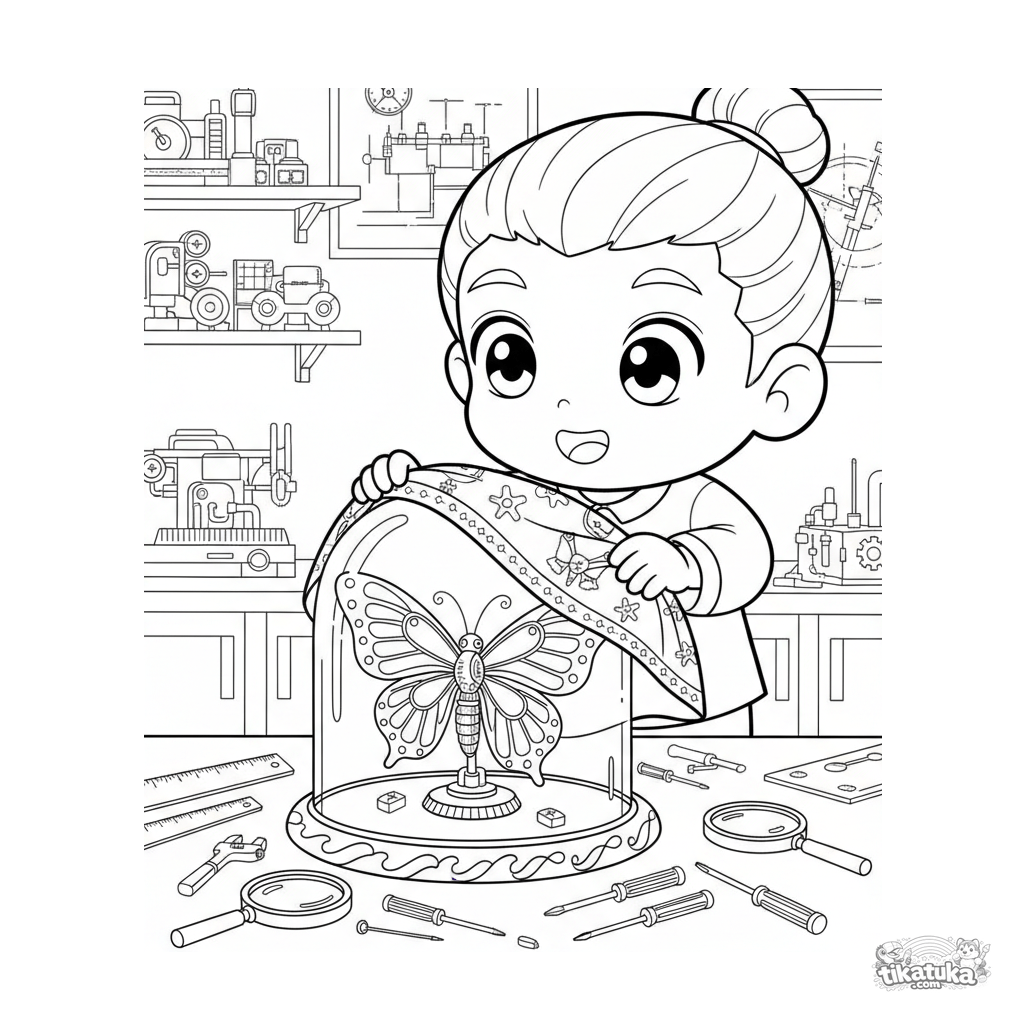 Coloring page for kids 7-9: a boy in a lab unveils a display case containing a delicate, wind-up mechanical butterfly with copper wings.