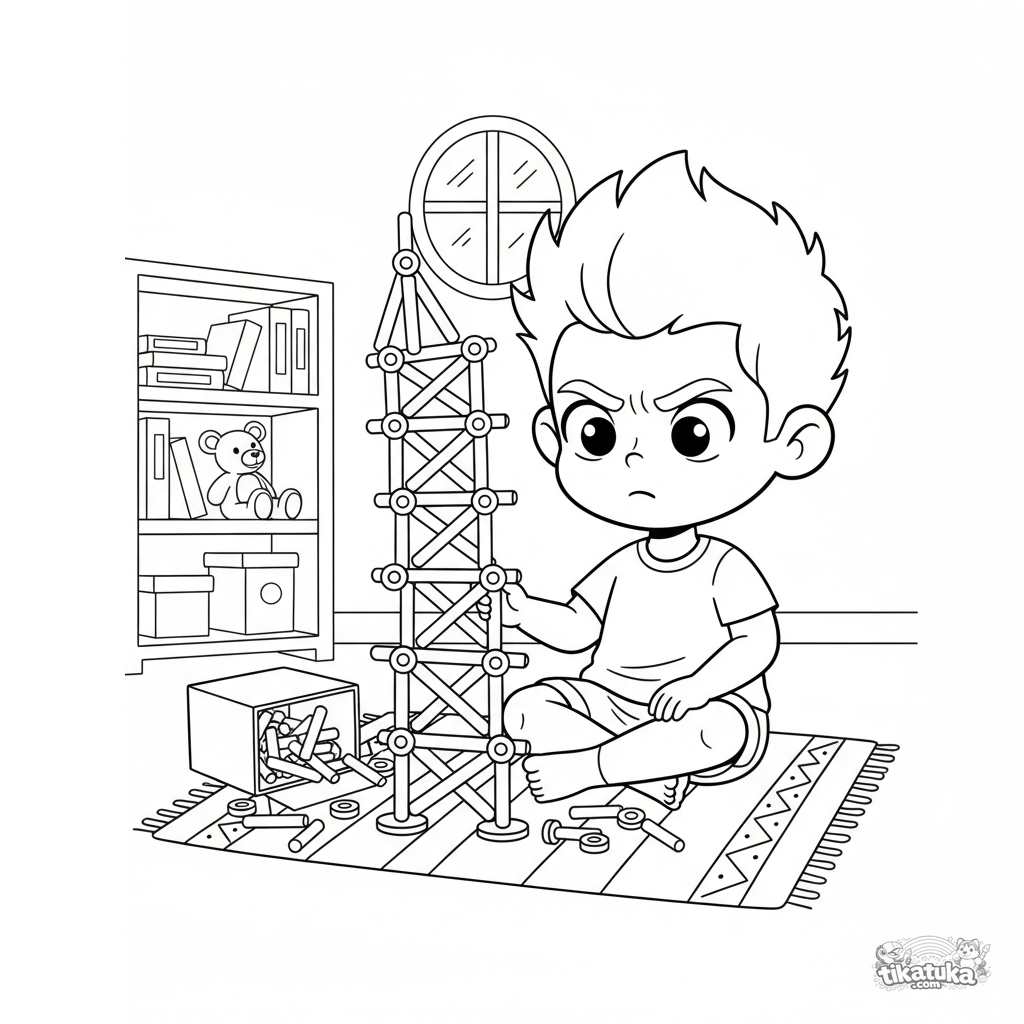 Coloring page for boys 4-6: an engaged boy builds a tall tower from construction toy parts. The scene encourages focus and is simple to color with clear outlines.