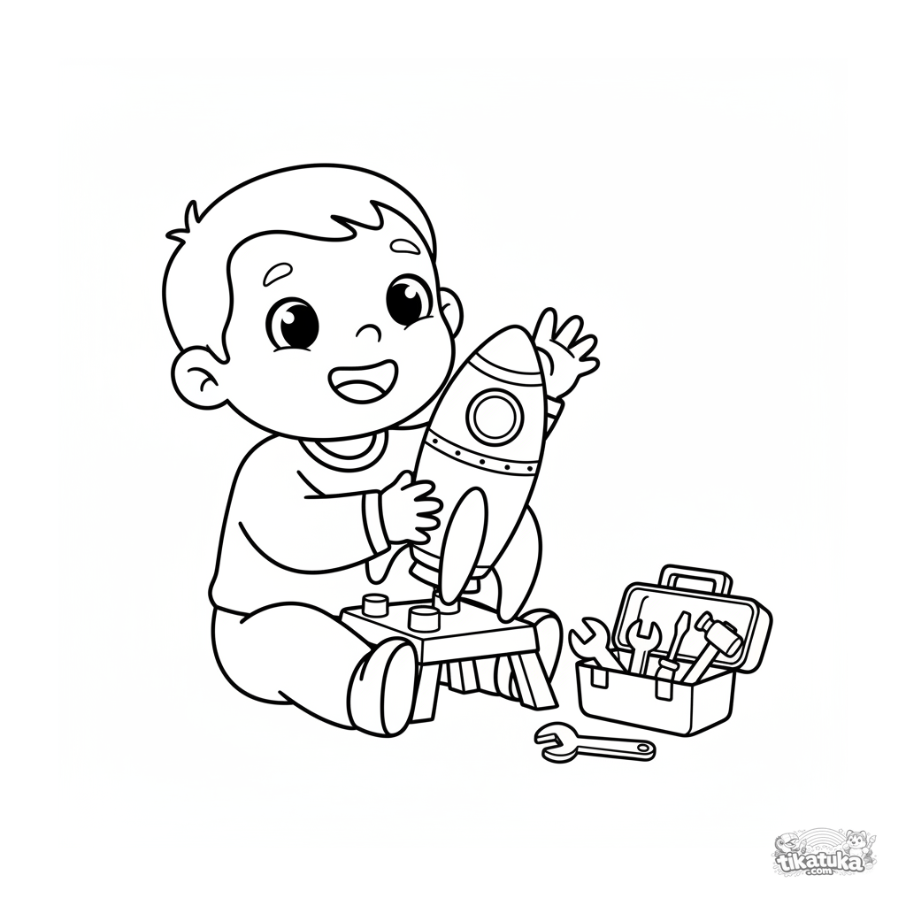 Very simple coloring page for toddlers 2-3: a boy assembling a toy rocket on a launch pad in the lab. Large details, perfect for first crayons.