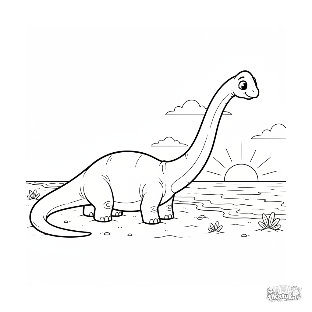 Coloring page for tweens 7-9: a brachiosaurus in watercolor-sketch style rests peacefully on the sand of an ancient ocean beach at sunset. Calm scene.