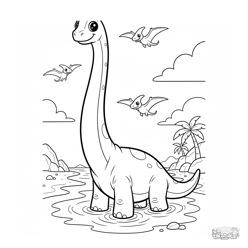 Coloring page for ages 7-9: a brachiosaurus wades in the coastal waters of an ancient ocean. Dynamic and fun style inspired by 90s cartoons.