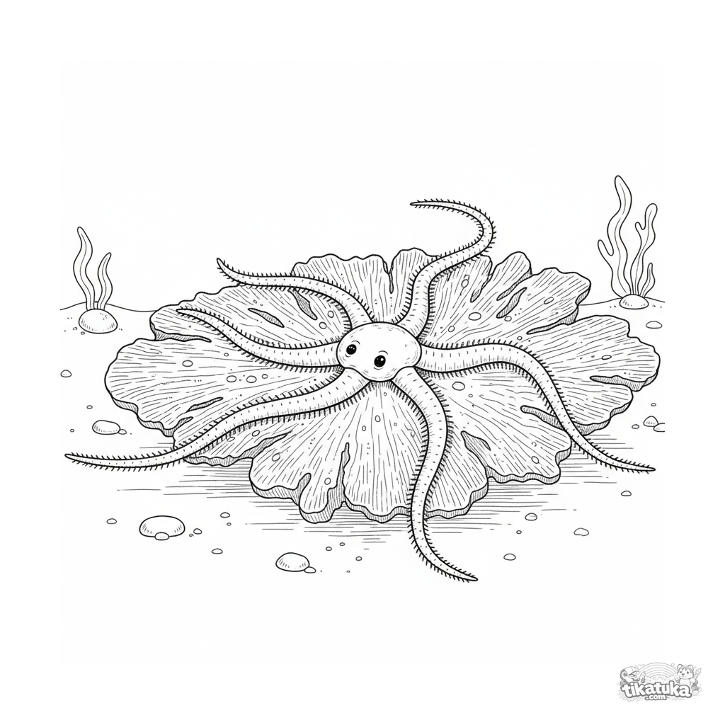 Coloring page for kids 7-9: a delicate brittle star crawls over sun-bleached coral in shallow water. Moderate detail in a vintage engraving style.