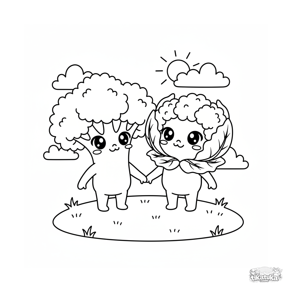 Coloring page with cute chibi characters: broccoli and cauliflower holding hands. For kids 4-6. Sparkly eyes, simple shapes, friendship theme.