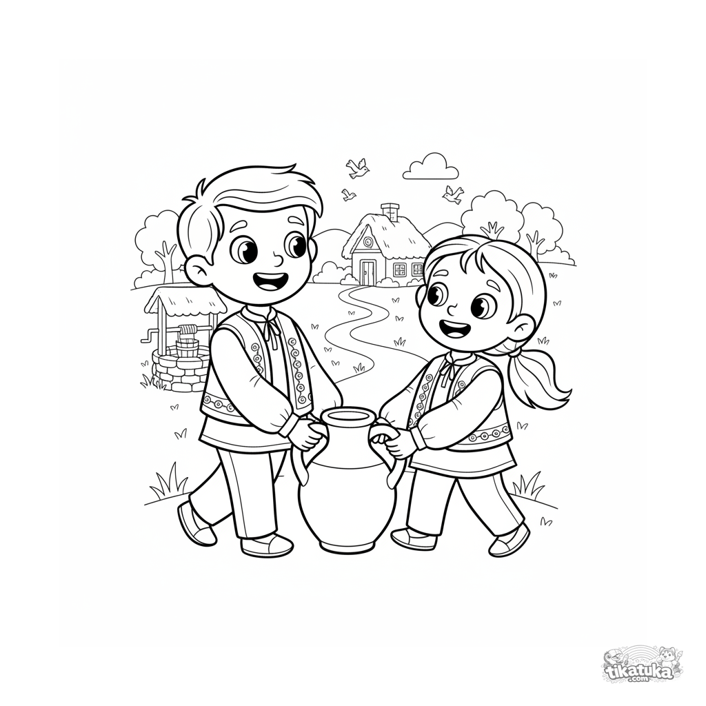Coloring page for kids 7-9: a brother and sister in folk vests carry a large water jug from the well. A scene about cooperation and village life.