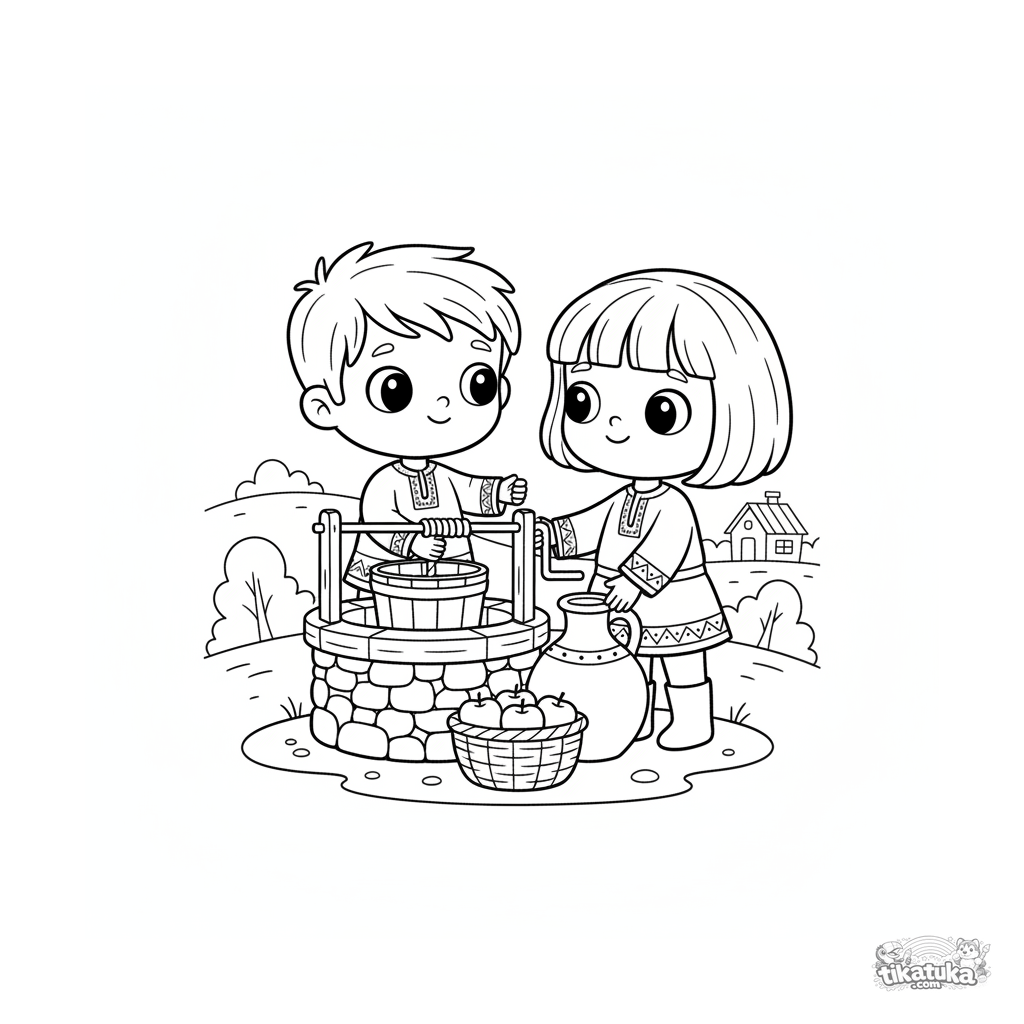 Coloring page for tweens 7-9: a brother and sister work together to draw water from the magical living well. A warm scene of cooperation in a folk style.