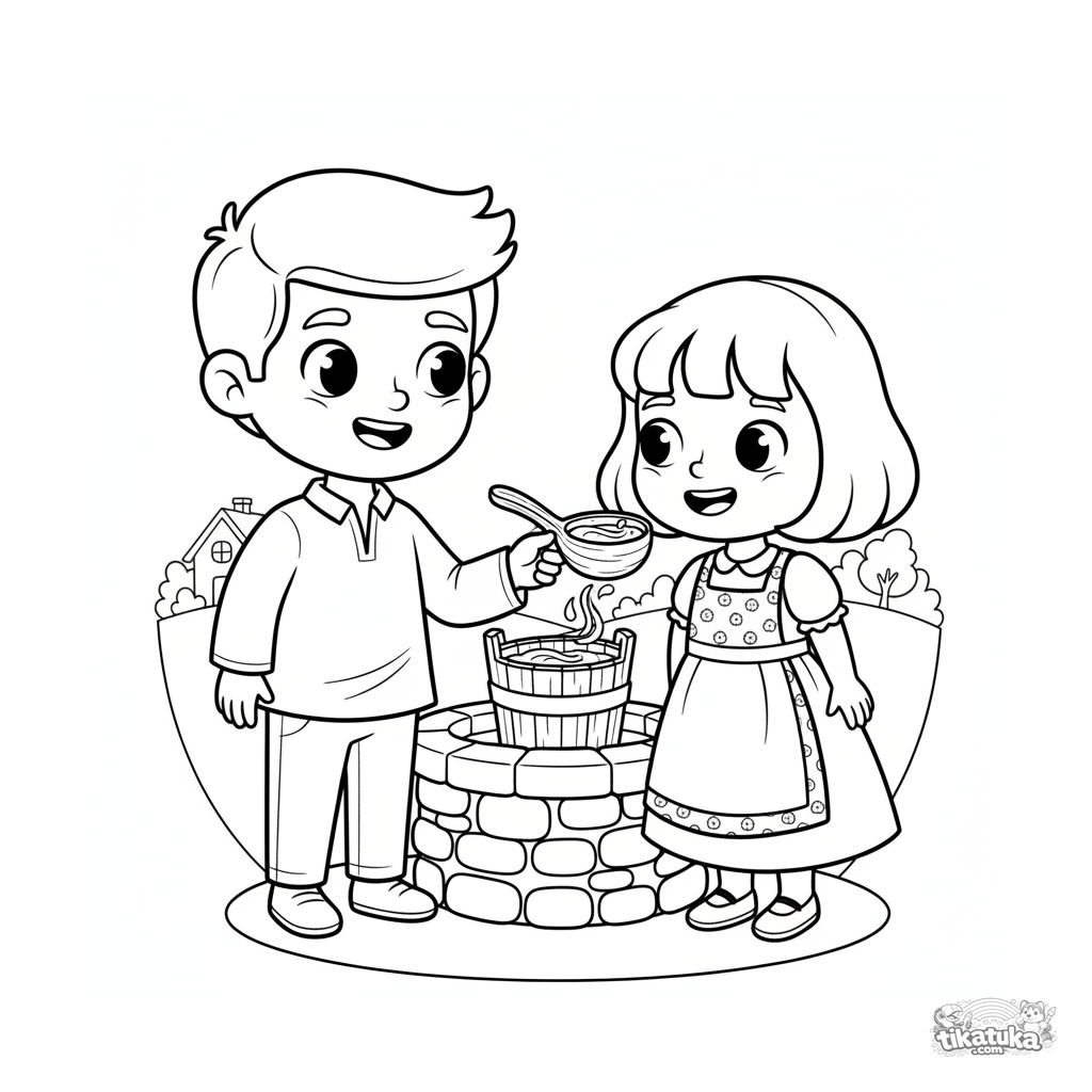 Coloring page for kids 7-9: a brother and sister in folk costumes drink water from the magic well. A warm scene about helping and family in a folklore style.