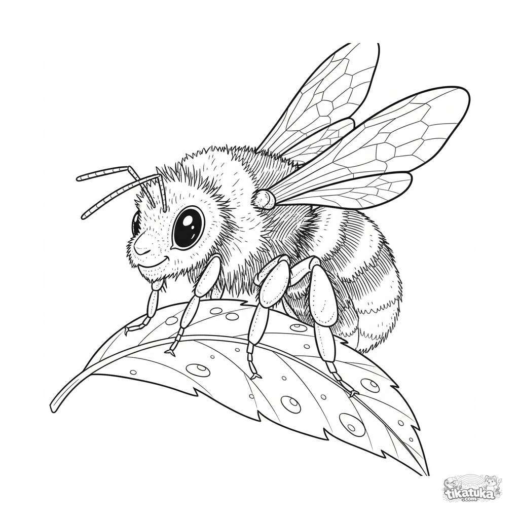 Detailed coloring page for older kids: a fluffy bumblebee dries its wings on a large leaf covered in morning dew. Fur and wing textures, realistic style.