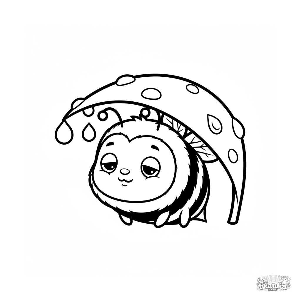 Toddler coloring page: a fuzzy bumblebee shelters under a large leaf with dewdrops. Large simple shapes, plush cartoon style.