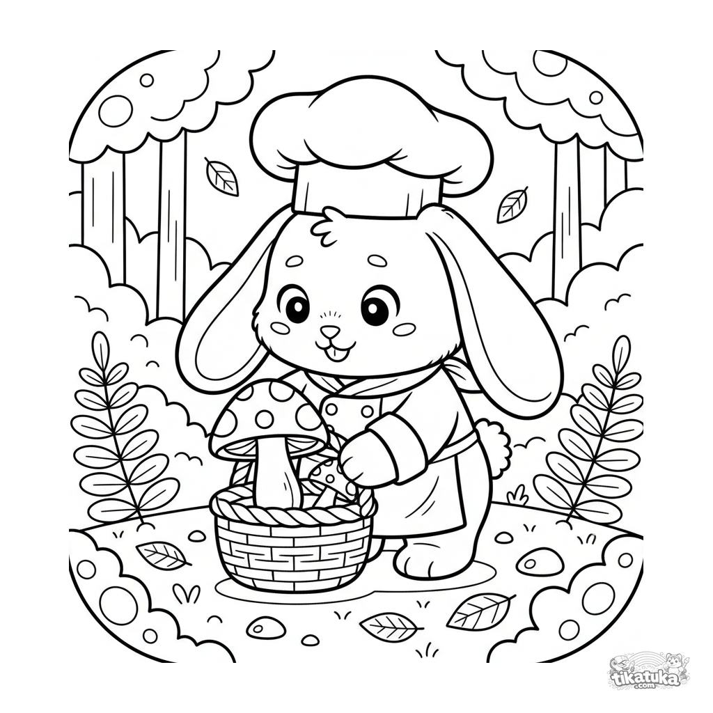 Coloring page for kids 4-6: bunny baker picking mushrooms in a forest basket. Cute woodland scene in Scandinavian toy style.
