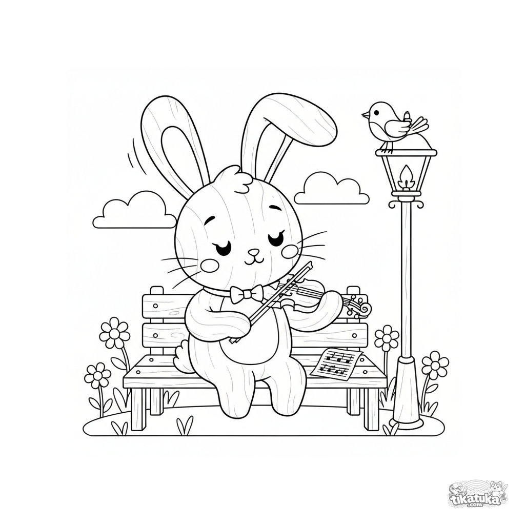 Coloring page for kids 4-6: bunny baker musician playing violin on a park bench. Peaceful scene in wooden-toy style with sheet music.