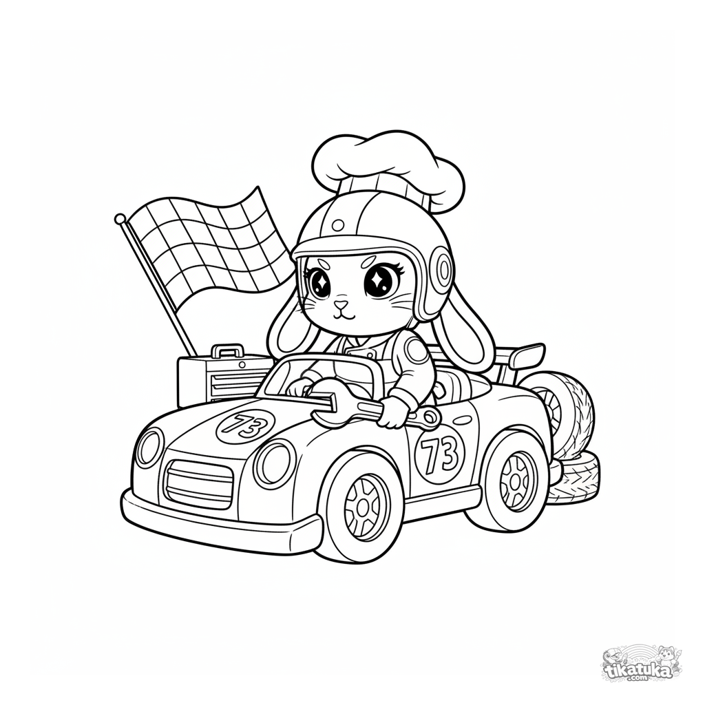 Coloring page for boys 4-6: bunny baker in a helmet works as a mechanic during a pit stop, tightening a wheel on a race car. Geometric wooden toy style.