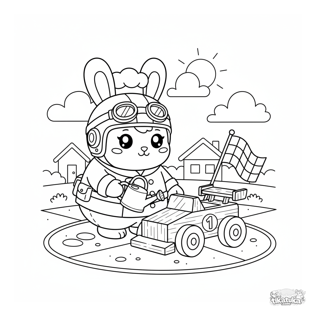 Coloring page for boys 4-6: bunny baker as a race car driver doing a pit stop for a toy car. Plush mascot style, simple shapes, wide margins.