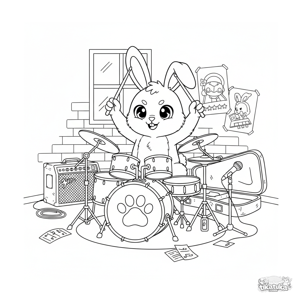 Kids coloring page: a bunny drummer practicing in a garage. Fun scene with a drum kit and musical gear. Ready to print and color.