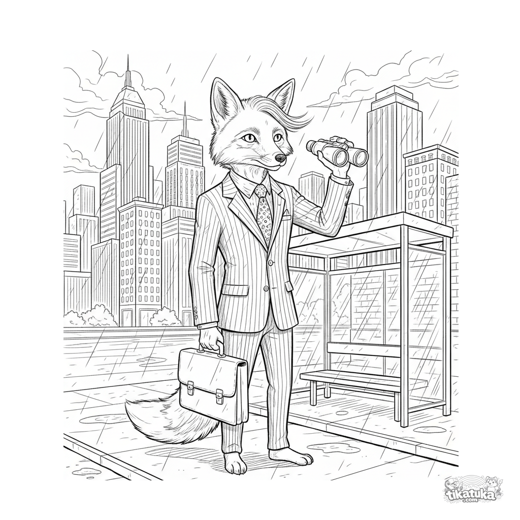 Coloring page for kids 10-12: a fox in a business suit with a briefcase and binoculars at a rainy bus stop, looking towards banks. Scene in urban sketch style.