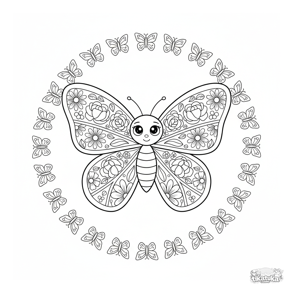 Detailed butterfly-shaped mandala coloring page for ages 10-12. The butterfly's wings are filled with different floral patterns, surrounded by a ring of leaves and tiny butterflies.