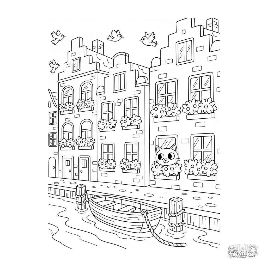 Kids coloring page: a cozy canal quarter with narrow houses, a boat, and a cat on a windowsill. A vibrant city scene in a wooden toy style.