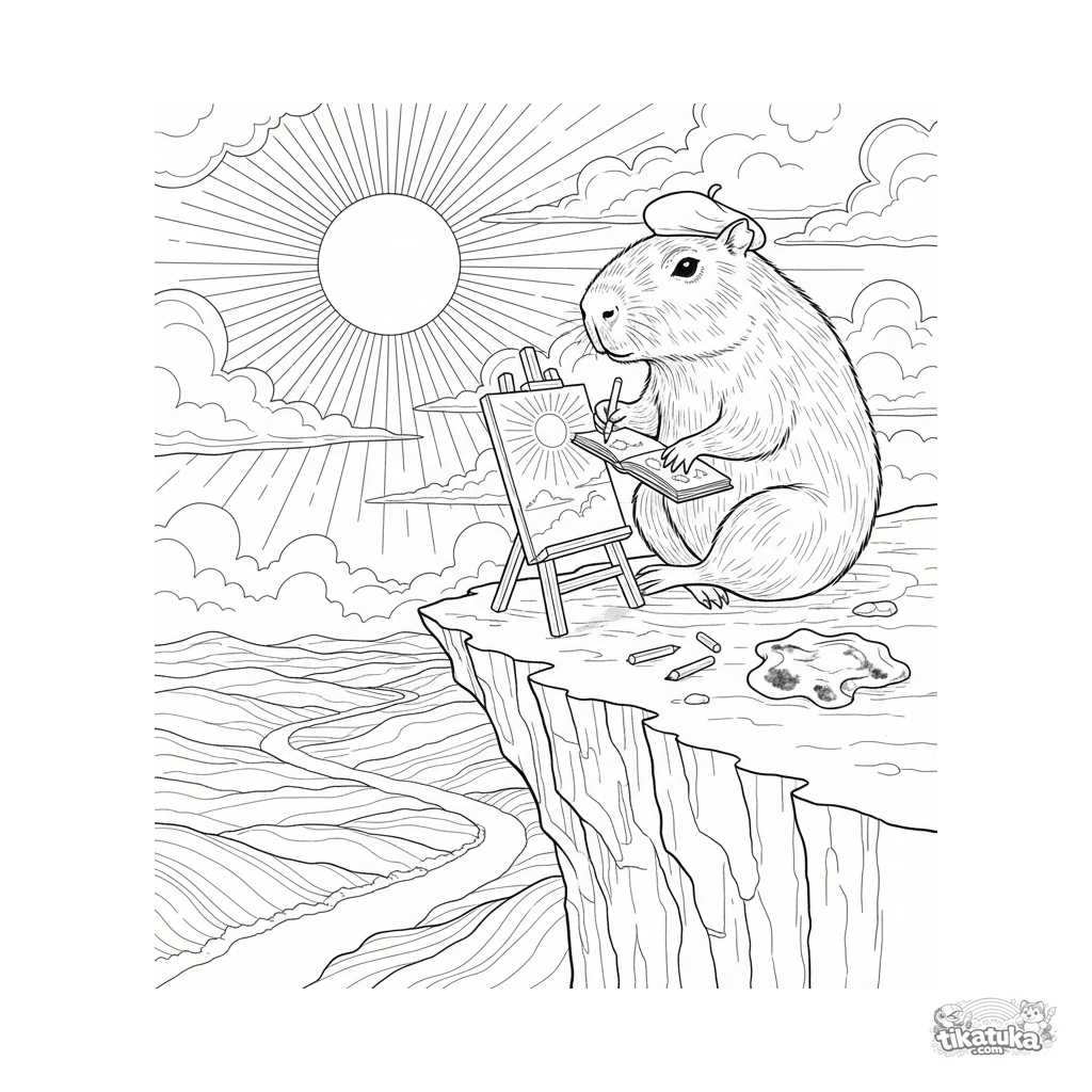 Detailed coloring page for kids 10-12: a capybara in a beret sketches the sunset at an easel. A scene about creativity and observing nature.