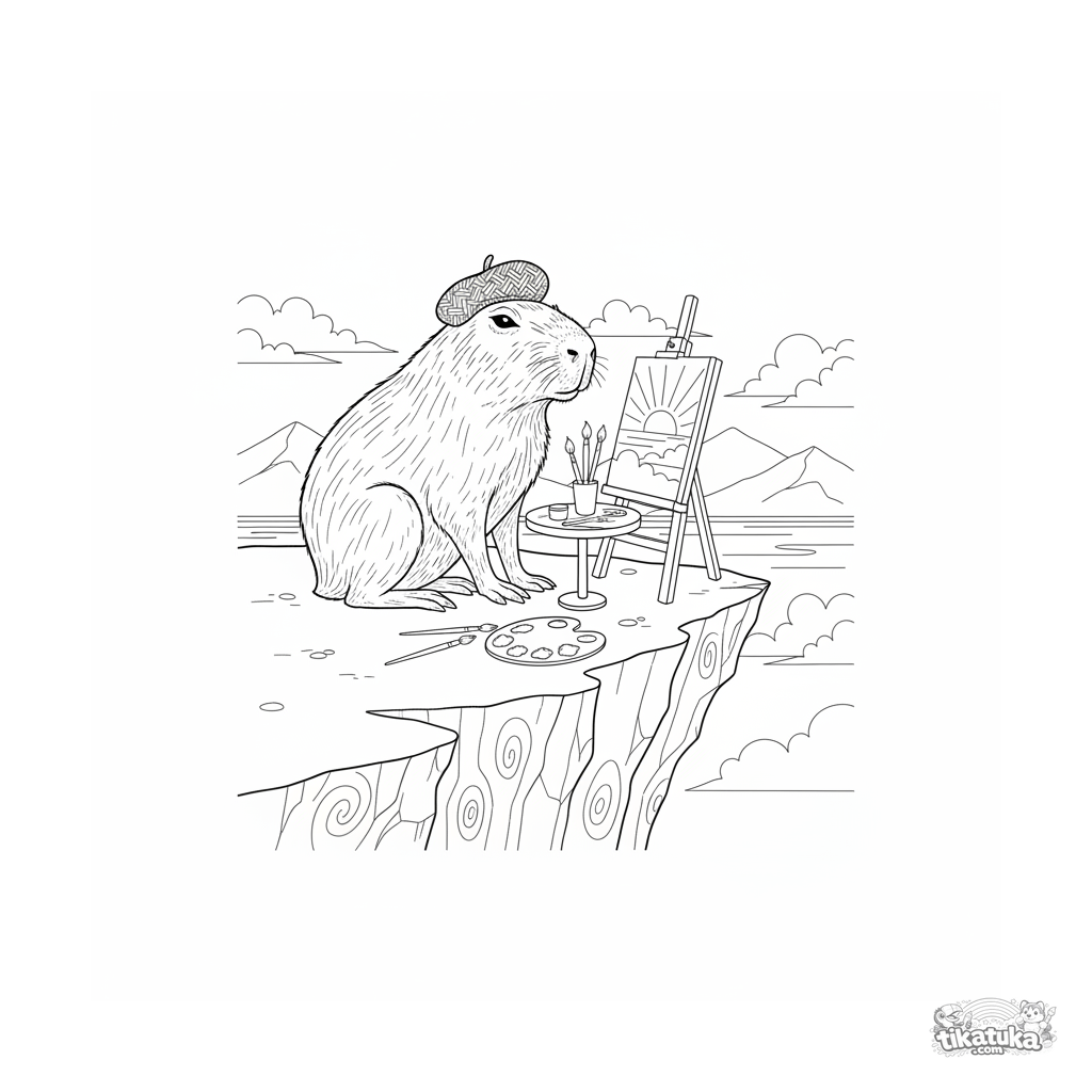 Detailed coloring page of a capybara artist painting the sunset on a cliff. A scene of creativity and contemplation for kids 10-12. Realistic field-guide style.