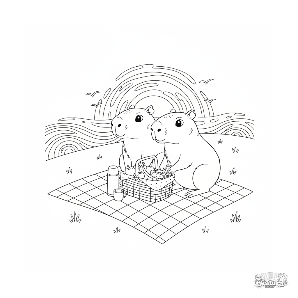 Detailed realistic coloring page: two capybara friends on a picnic watch the sunset. A scene of friendship and tranquility for kids 10-12.