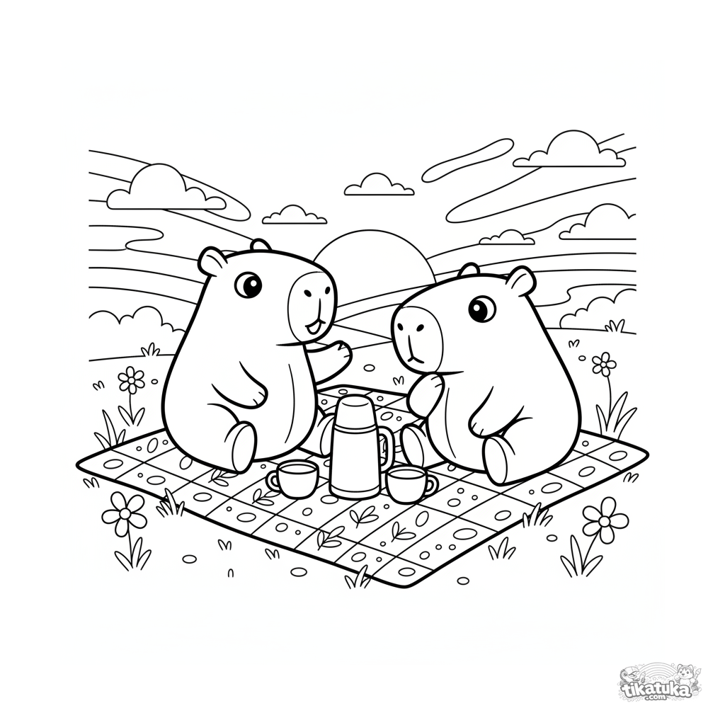 Coloring page for kids 4-6: two capybara friends sit on a blanket in a meadow sharing stories at sunset. A cute scene of friendship and conversation.