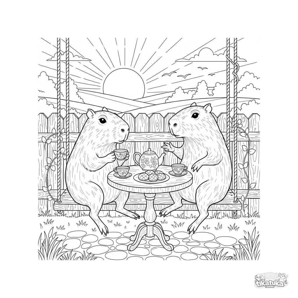 Detailed field-guide style coloring page: two capybaras sharing tea on a porch swing at sunset. For kids 10-12 years old.