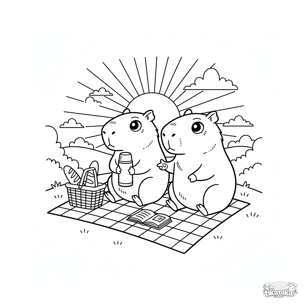 Coloring page for kids 7-9: two capybara friends on a picnic watching the sunset. A scene of friendship, coziness, and philosophical calm on a hill.
