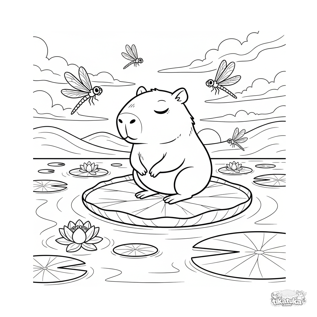 Coloring page for kids 4-6 years old: a calm capybara meditating on a large water lily in a pond at sunset. A scene about harmony and tranquility.