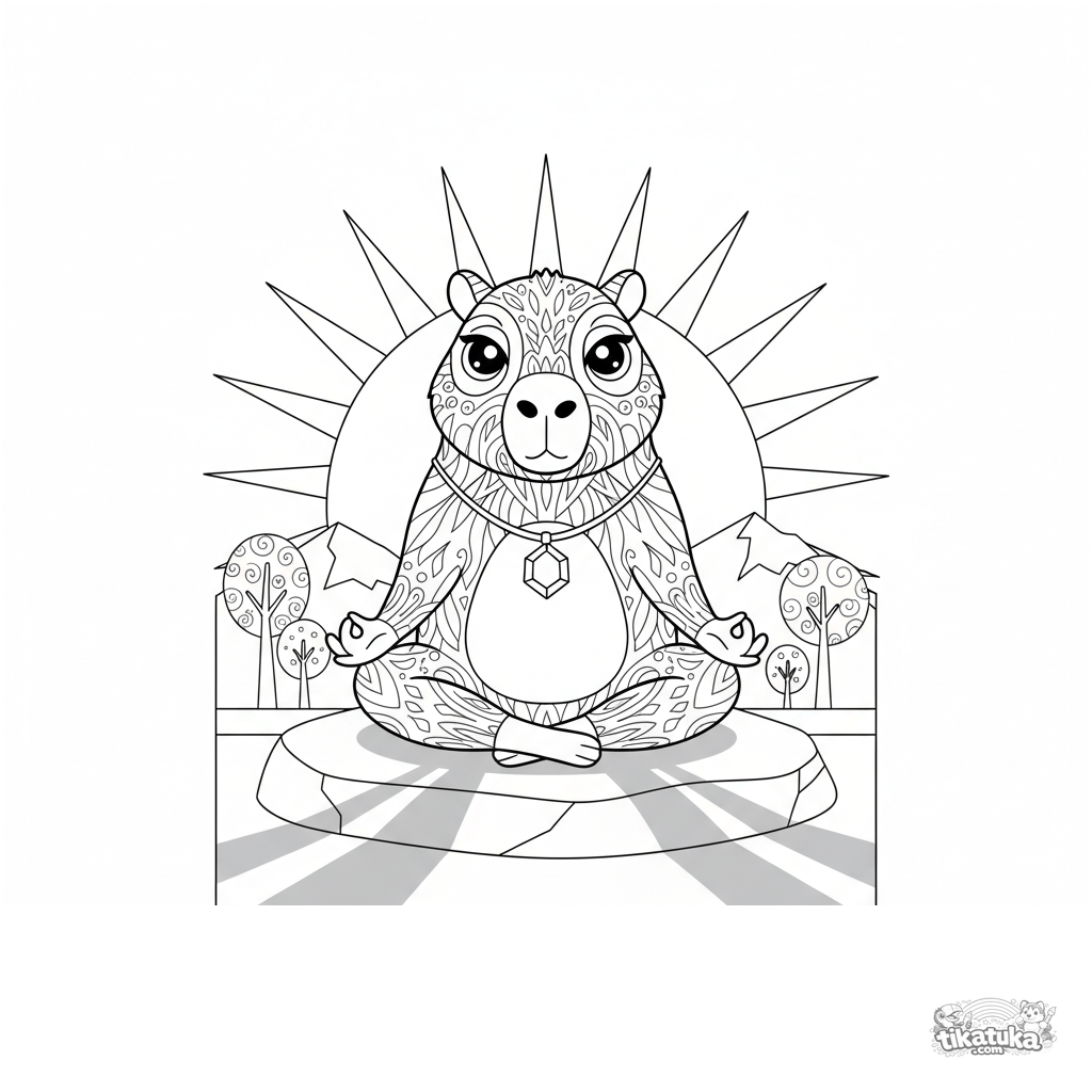 Stylish minimalist coloring page for kids 10-12 years old: a capybara in lotus pose meditates at sunset. Geometric shapes, clean lines, a scene for focus and relaxation.