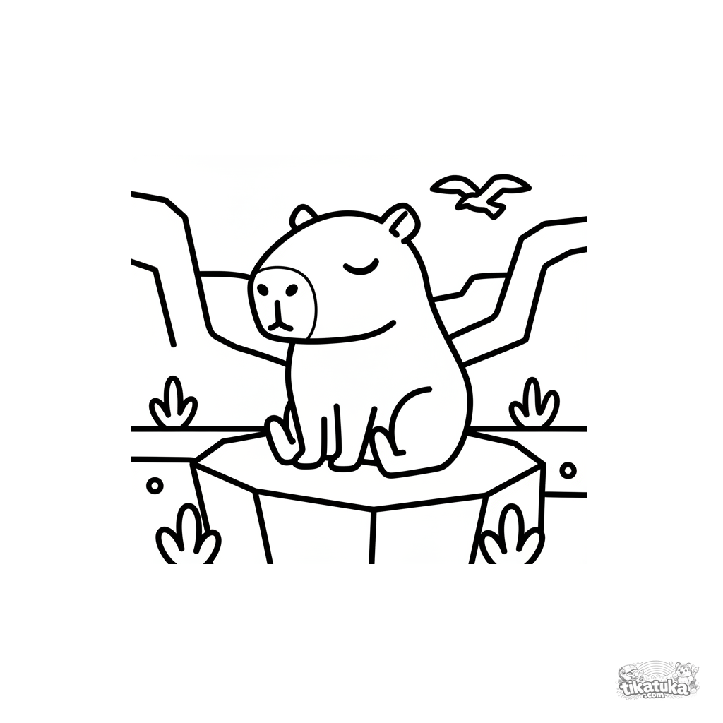 Very simple coloring page for toddlers 2-3: a capybara meditating on a rock against a canyon sunset. Large clear shapes.