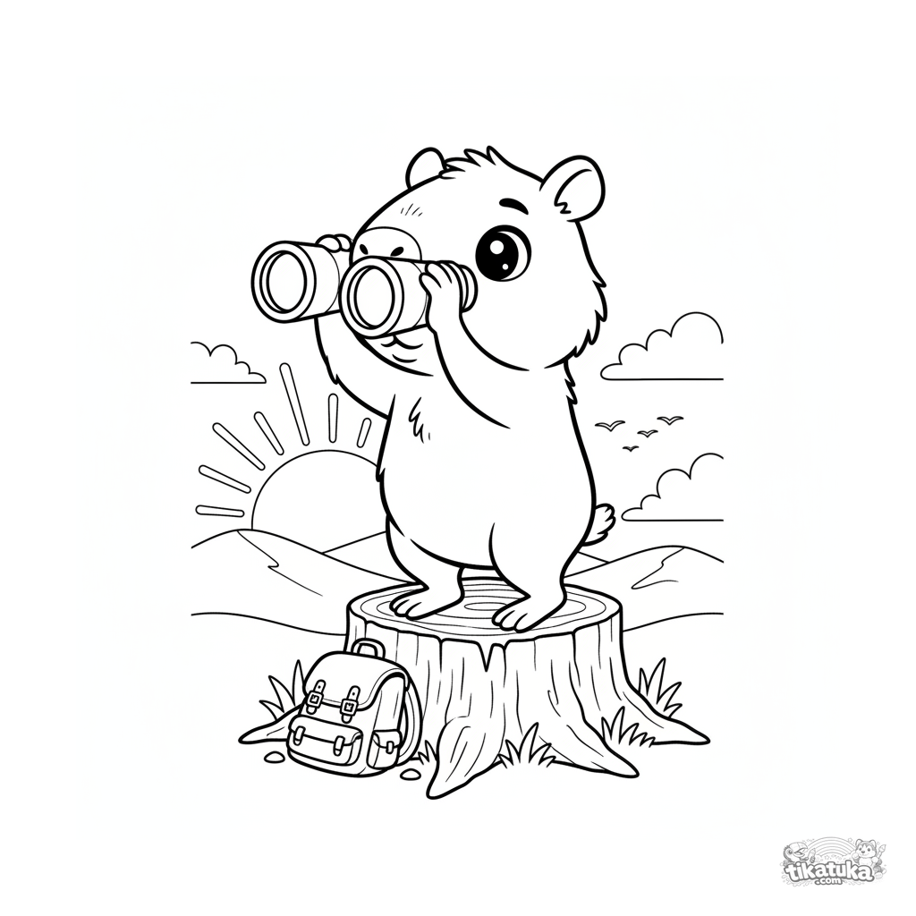 Coloring page for kids 4-6: a curious capybara stands on a stump watching the sunset through binoculars. Dynamic pose, clear shapes, full body visible.