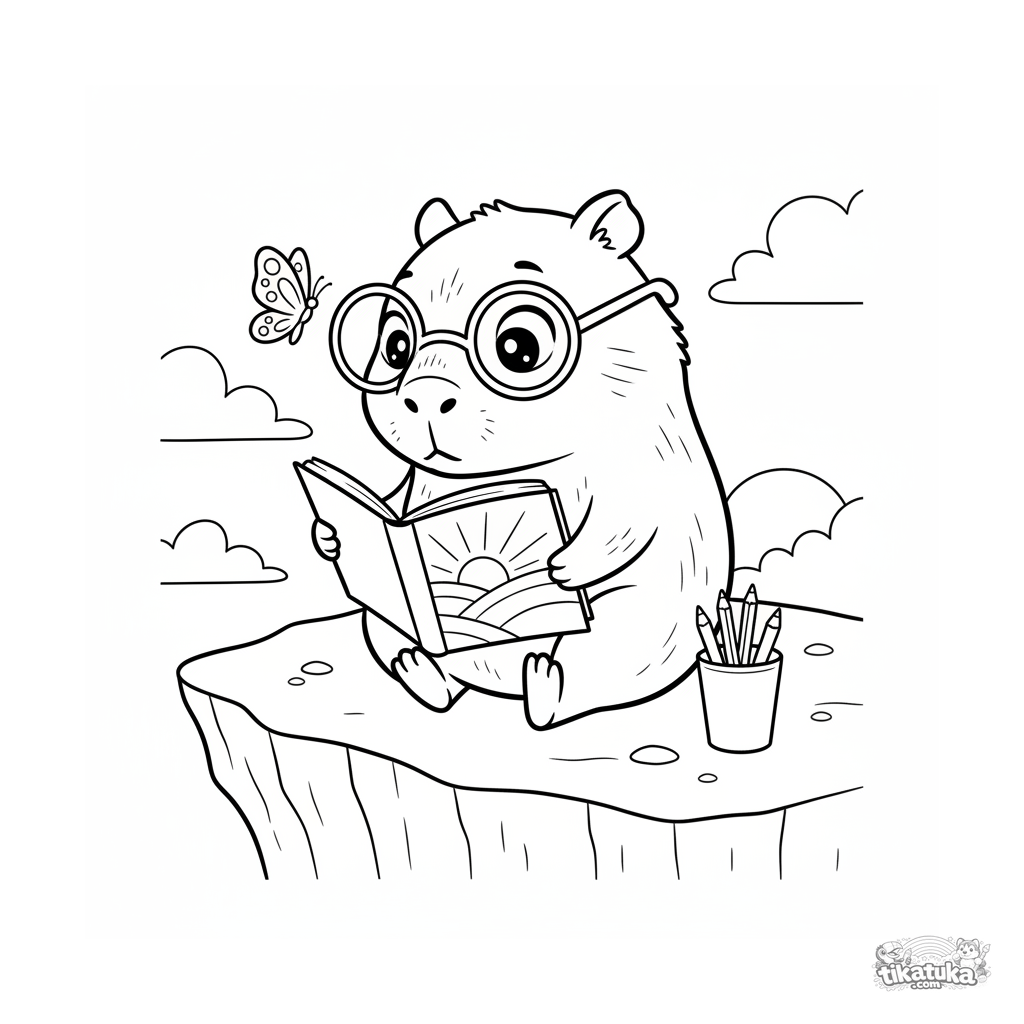 Coloring page for ages 4-6: a capybara with glasses draws the sunset in a sketchbook while sitting on a cliff. Cute anime style, clear shapes, a scene of creative calm.