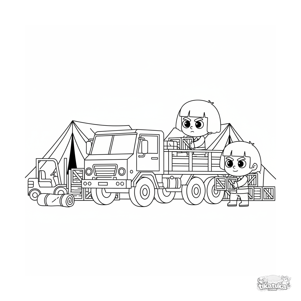 Coloring page for tweens 7-9: a military cargo truck being loaded with wooden supply crates at a field headquarters. Soldiers work as a team. Dynamic outlines.