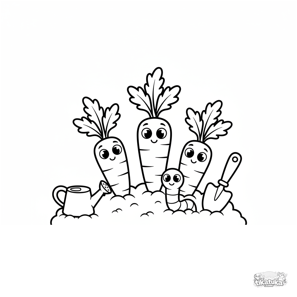 Simple coloring page for toddlers 2-3: three cheerful carrots growing in soil in a garden bed. A worm, watering can, and trowel are nearby.
