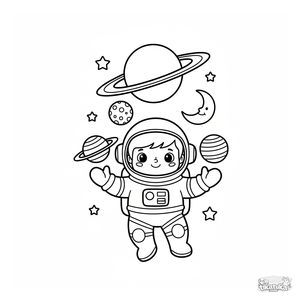 Fun coloring page: an astronaut juggles planets in front of a ringed gas giant. For toddlers 3-6. Simple outlines and wide white margins.