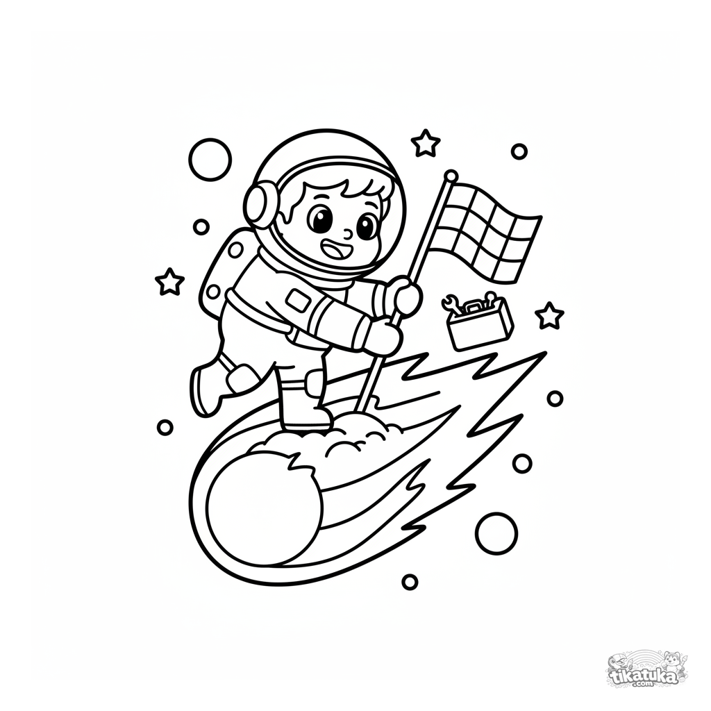 Easy coloring page for toddlers 2-4. A cartoon astronaut plants a flag on a flying rainbow comet. Large shapes, few details, wide margins.