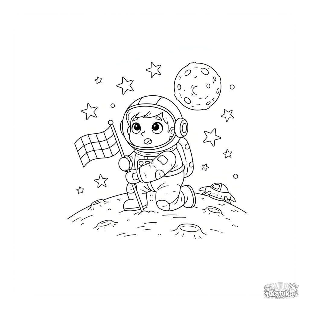 A space coloring page featuring a cheerful astronaut planting a flag on the surface of a ringed planet. A simple cosmic scene for children aged 4-6.