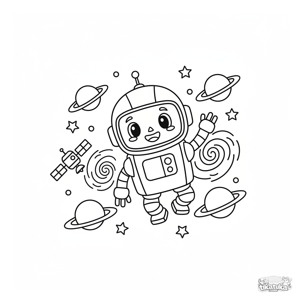 Coloring page of a friendly astronaut robot floating among outlined planets and stars. For kids aged 5-8. Clear outlines on a white background.