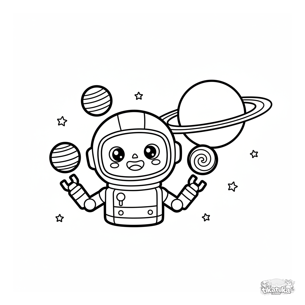 Simple coloring page for toddlers: a cute astronaut robot juggling planets in space. For kids aged 2-5. Large shapes, low detail, fun and friendly scene.